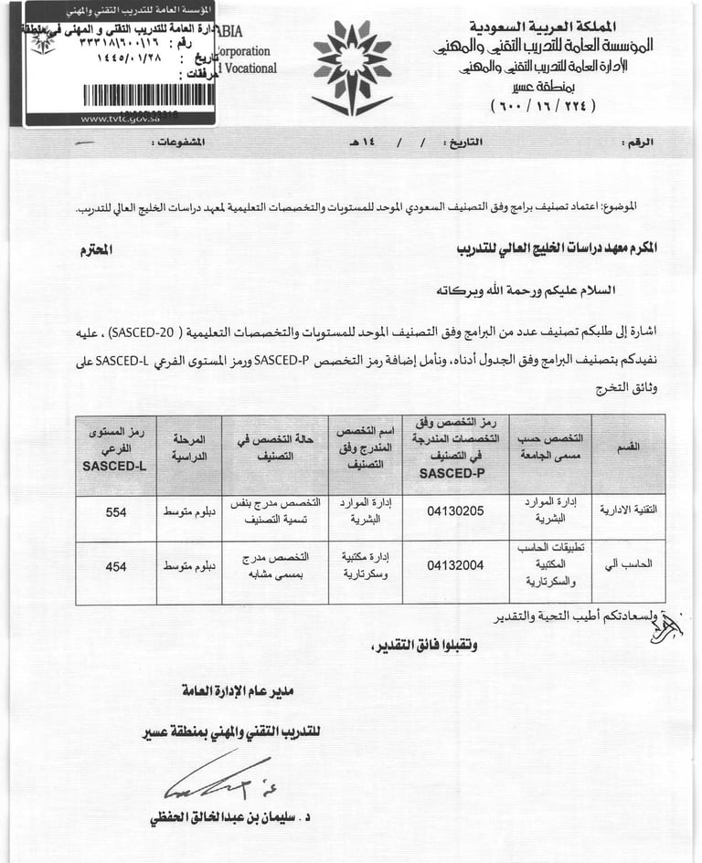 معتمدون لدى المؤسسة العامة للتدريب التقني والمهني والمركز الوطني للتعليم الإلكتروني، ومؤهلاتنا مصنفة في التصنيف السعودي الموحد للتخصصات والمؤهلات التعليمية